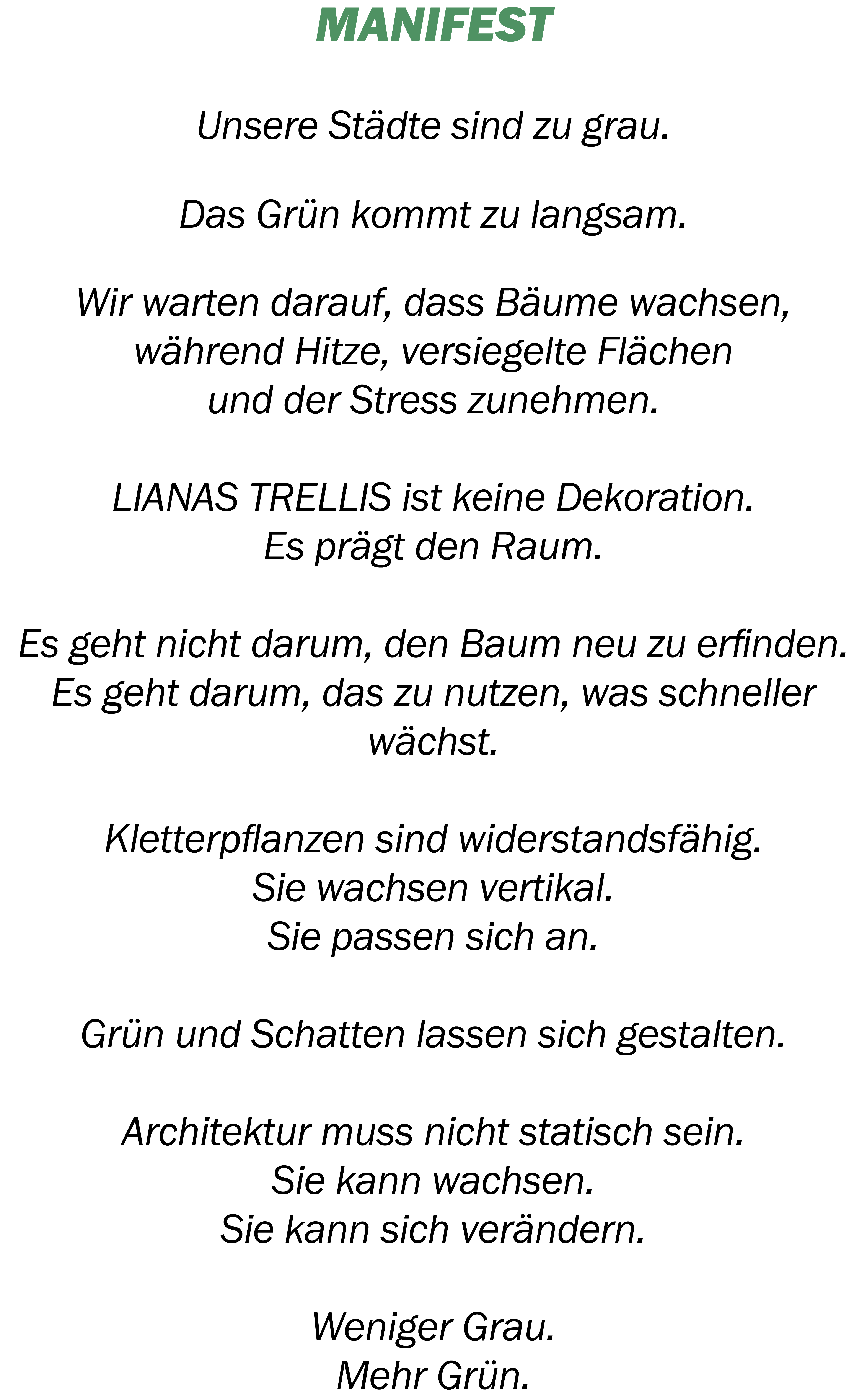 Unmittelbar nach der Installation ist das architektonische Rankgitter sichtbar und prägt den Raum. Nach und nach erobern Kletterpflanzen es und formen seinen Charakter. Innerhalb weniger Jahre füllen sich zuvor offene Bereiche mit Grün, spenden Schatten und tragen zu einem kühleren, angenehmeren Stadtklima bei.